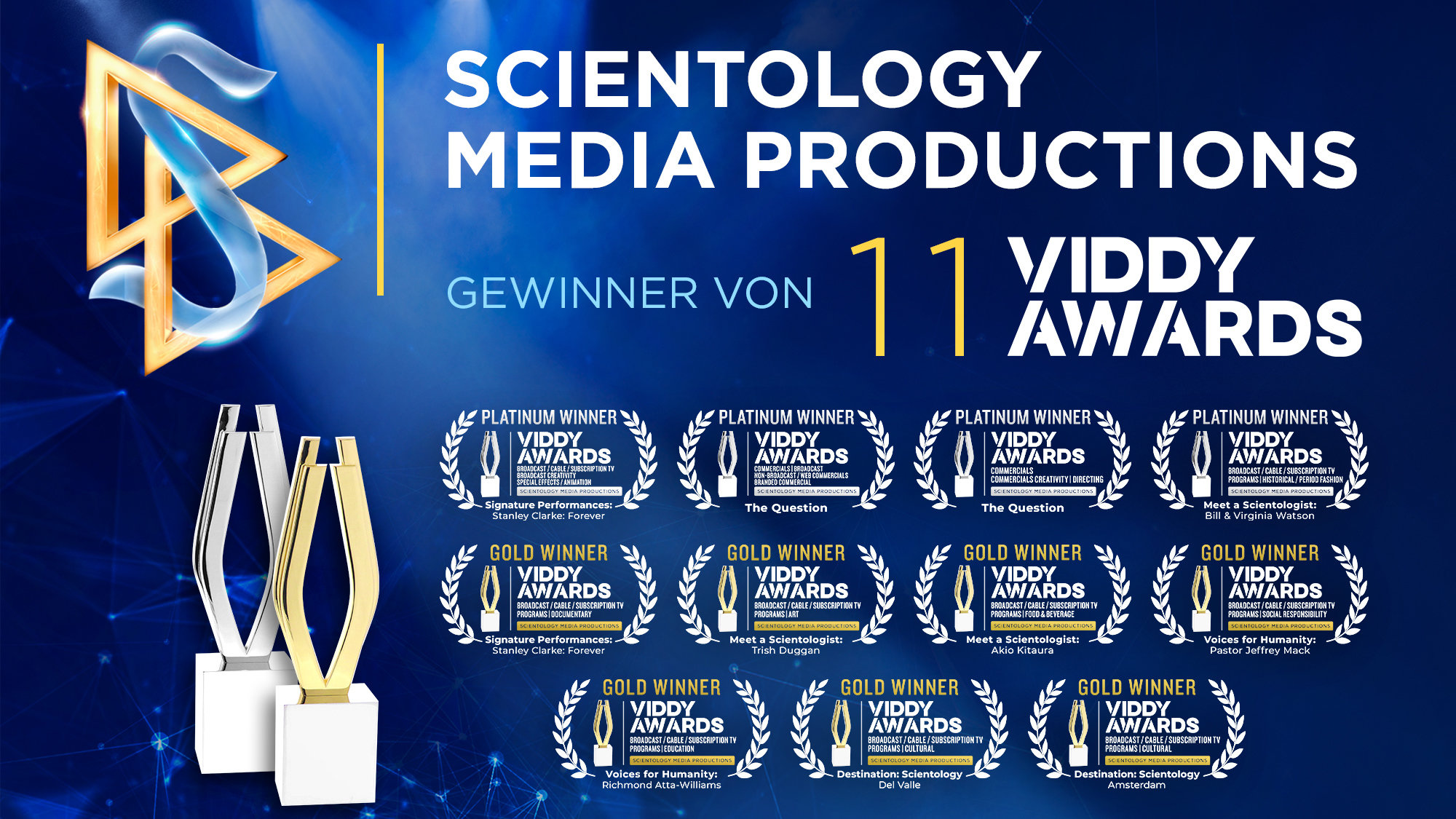Scientology Media Productions ist stolz darauf, seinen Erfolg bei den Viddy Awards 2025 bekannt zu geben, bei denen es elf Auszeichnungen erhielt, darunter vier Platin- und sieben Gold-Awards, für außergewöhnliches Storytelling und Exzellenz in der Videoproduktion.