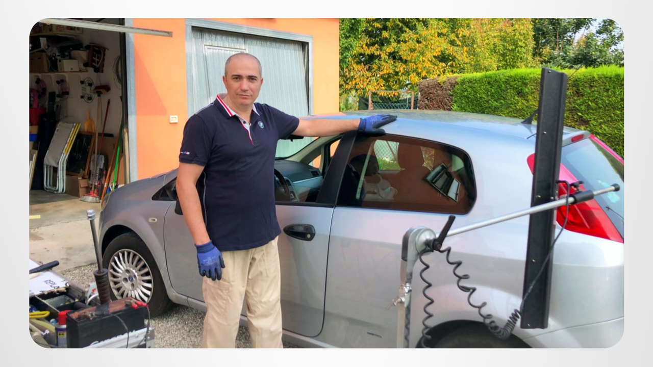 Eine Delle verschwinden zu lassen ist nichts für Karosserie-Maestro Alfonso. Er hat die Werkzeuge und den Sachverstand, um an sogar den unzugänglichsten Stellen Kerben herauszuschlagen. Und er bleibt die ganze Zeit über gelassen, denn er weiß, wie man sogar unter härtesten Umständen mit Verwirrung umgeht. Er erhielt diesen Sachverstand durch das Studium des Buches Die Probleme der Arbeit.