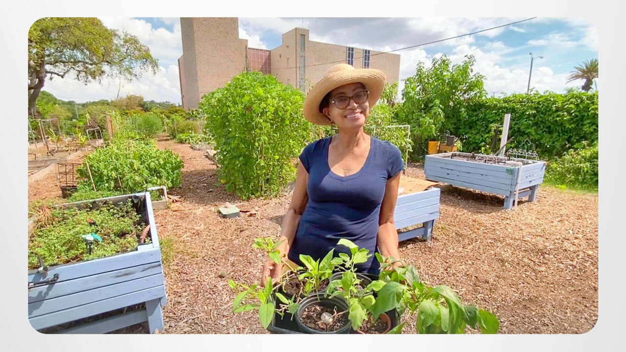 June pflanzt heute für die Ernte morgen. In naher Zukunft wird sie ernten, was sie sät, wobei ihre Bemühungen sich in Erzeugnissen bezahlt machen – Auberginen, Spinat und grüne Paprika.