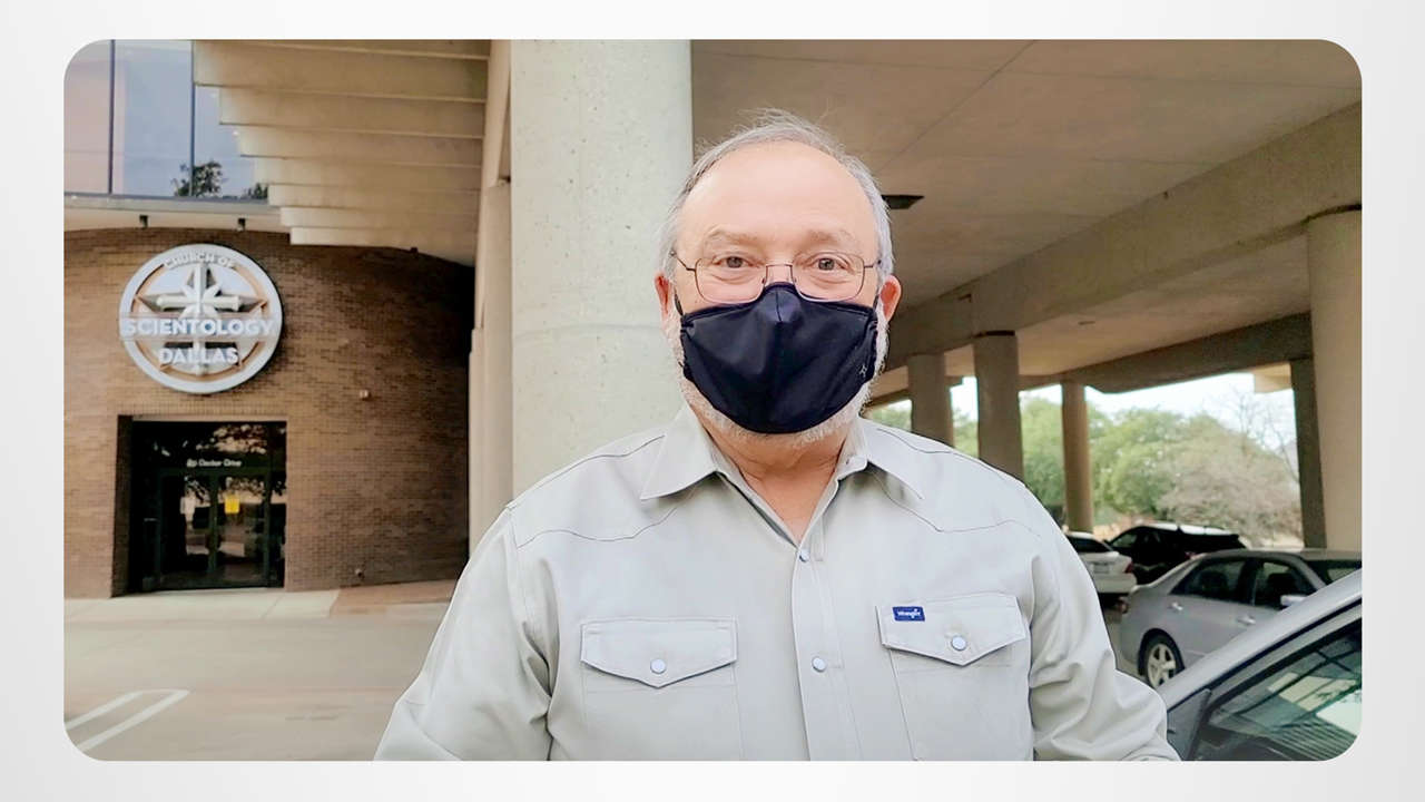 Larry no veía la hora en que la Iglesia de Scientology de Dallas volviera a abrir sus puertas. Y cuando lo hizo, ¡él estaba listo! Cruza el umbral con entusiasmo para empezar el estudio del estudio, literalmente. Eso es porque está aprendiendo a aprender de un curso sobre la Tecnología de Estudio.
