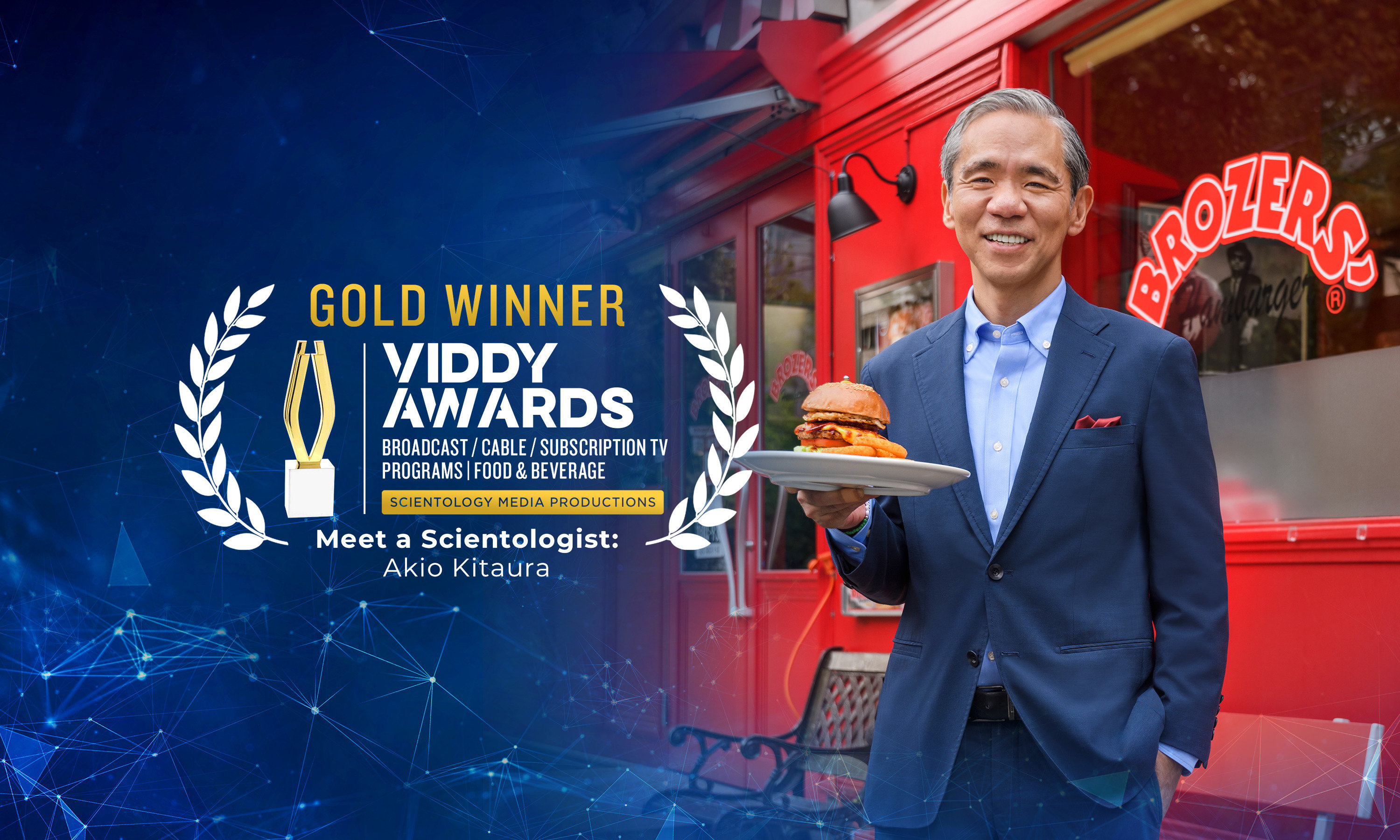 Akio Kitaura est le fondateur de Brozers’, la chaîne de hamburgers gastronomiques numéro 1 au Japon. Avec un engagement envers un artisanat de qualité et une philosophie consistant à « mettre du cœur » dans tout ce qu’il crée, Akio a fait de Brozers’ un favori à l’échelle nationale, mis en lumière dans près de 100 reportages médiatiques. Ce Viddy Award d’or récompense l’excellence de l’épisode Meet a Scientologist pour avoir mis en lumière l’impact profond d’Akio à la fois sur le monde culinaire et sur sa communauté.