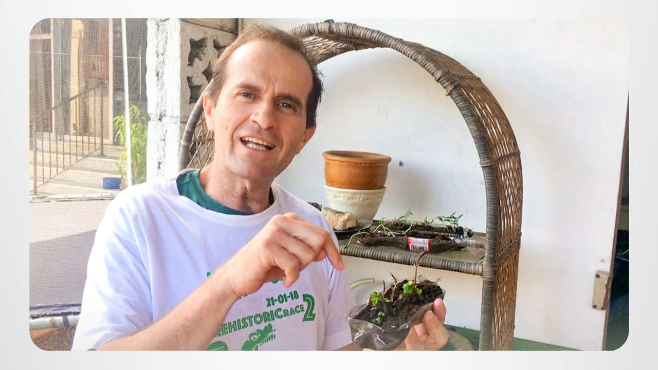 Un arbre pousse dans le jardin d’Otto. En fait, cet agriculteur urbain commence avec les graines, des matériaux recyclés et un peu d’eau pour faire pousser plusieurs arbres fruitiers et des légumes frais. Il reste calme et ne se sent pas déstabilisé par les mauvaises nouvelles car il étudie le livret Solutions à un environnement dangereux.