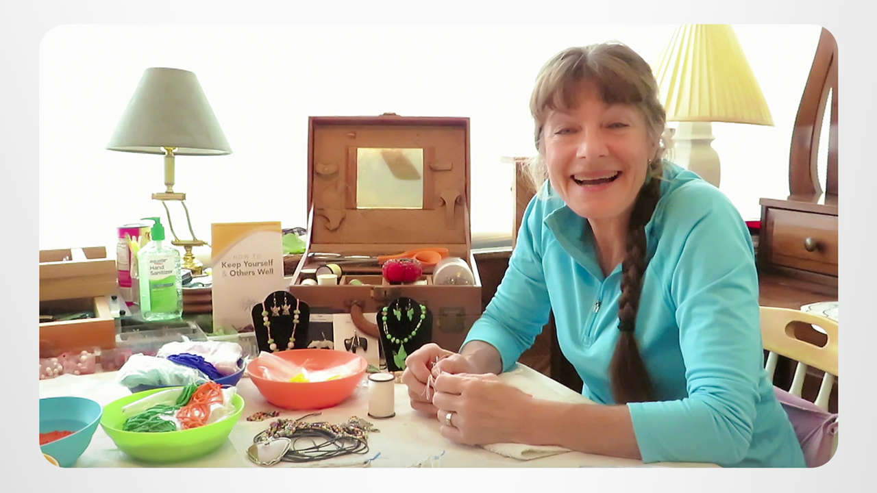 Saiyo rassemble ce qu’il faut pour faire des colliers durant le confinement. Avec l’assistance de sa petite-fille Annabelle, elle fabrique des accessoires de mode avec des perles de couleurs vives. Pour Saiyo, le plus important durant cette période est d’aider les enfants et de rester travailleur — deux préceptes du Chemin du bonheur.