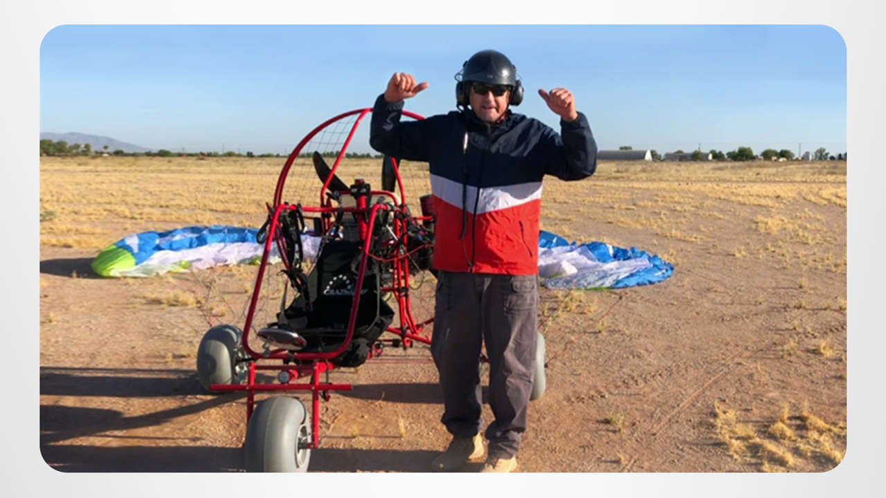 新しいスポーツをやろうと探した時、パトリックはテニスやゴルフで妥協しませんでした。 その代わりに、彼はモーター・パラグライダーで空へと飛び立ちました。 モーターパワー3輪は彼を空中へと押し上げ、パラシュート・スタイルのウィングが彼をそこに留めます。 それは、パトリックが人生でプレーする多くのゲームのうちの1つ。彼が『Scientology:人生への新しい視点』を読んで得た概念です。