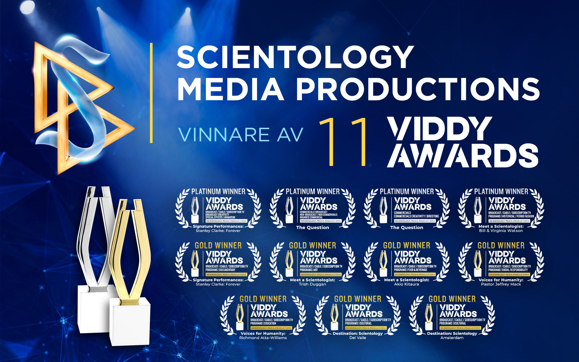 Scientology Media Productions är stolta över att kunna meddela sin framgång vid 2025 års Viddy Awards, där de tilldelades elva utmärkelser, inklusive fyra Platina-utmärkelser och sju Guld, för exceptionellt berättande och enastående videoproduktion.