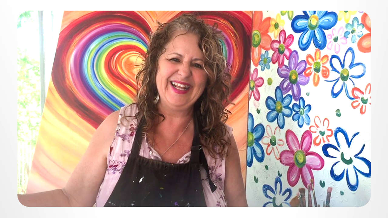 藝術家黛比位在矽谷的畫室充滿色彩。她利用待在家裡的時間,讓畫布充滿活力,並透過線上課程教導他人做一樣的事。對黛比來說,這全都與散播《快樂之道》有關。